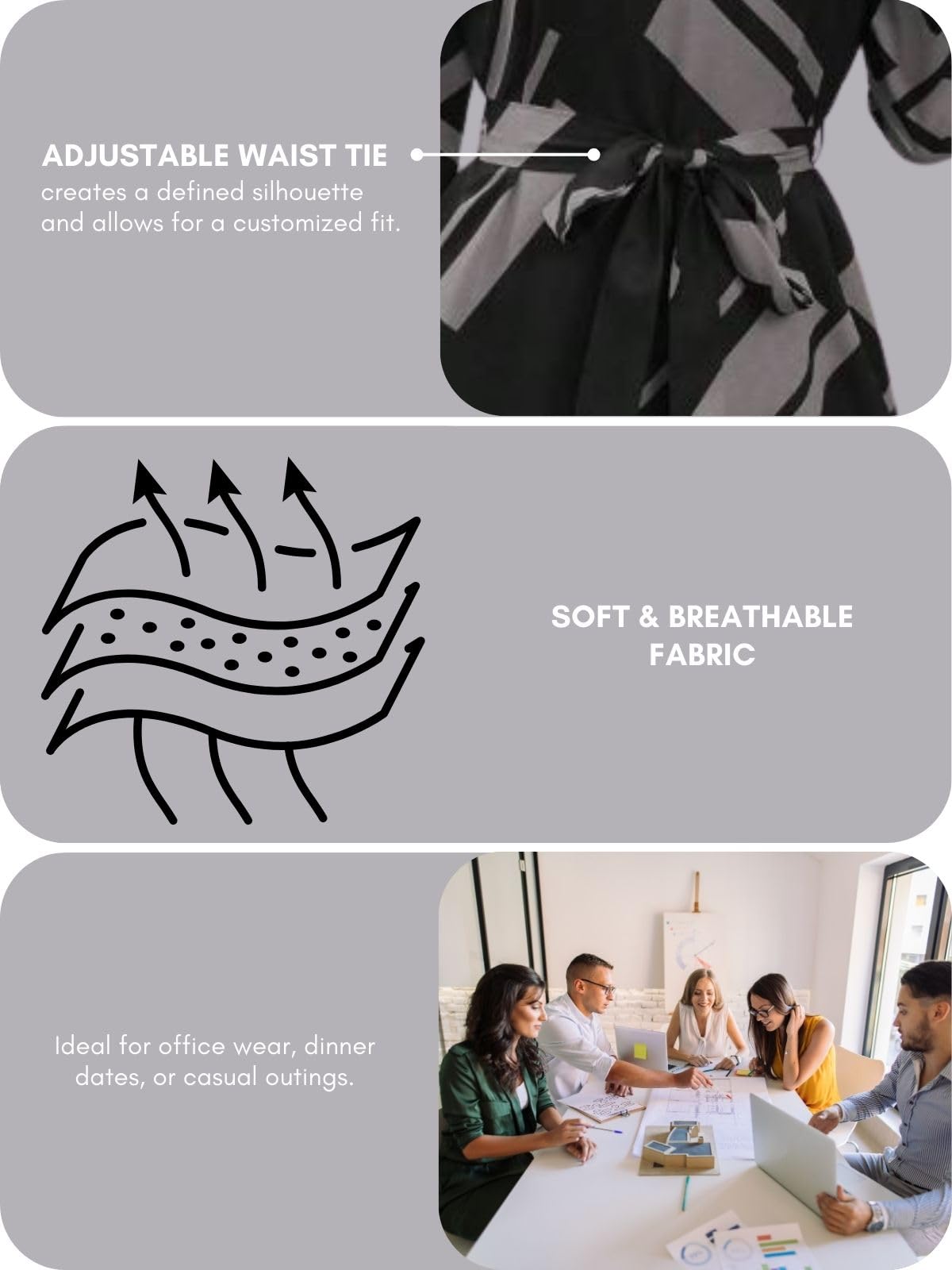 Elevate your wardrobe with this stunning dress featuring a contemporary wave design and a flattering waist belt.