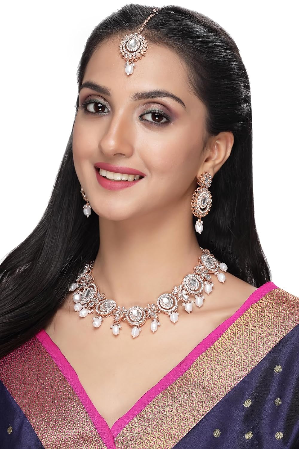 Sukkhi Traditional Gold Plated AD Stone Collar Bone Necklace Set With Earring And Maangtika | Jewellery Set For Women (NS105700)